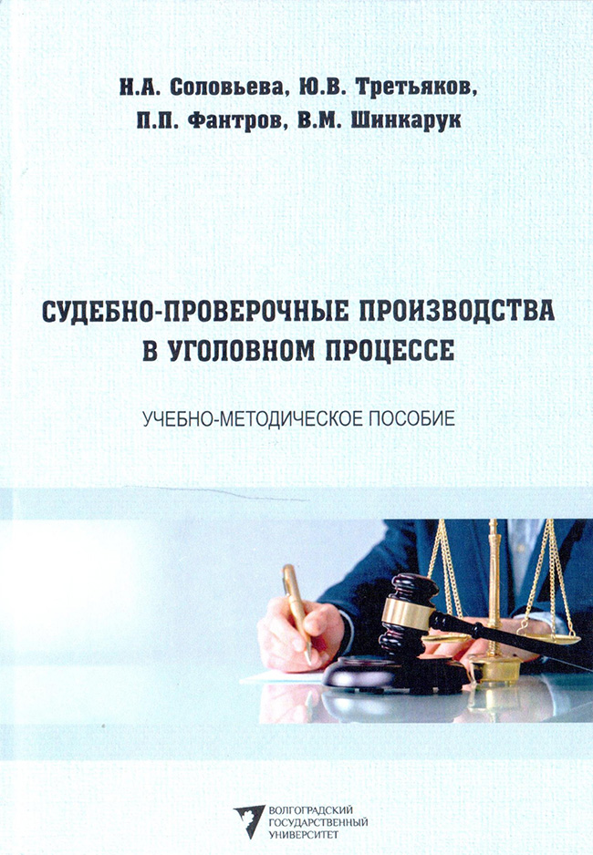 Судебно-проверочные производства в уголовном процессе : учебно-методическое пособие для студентов специальности 40.05.04 Судебная и прокурорская деятельность и слушателей отделения дополнительного профессионального образования ВолГУ, обучающихся по программе профессиональной переподготовки “Юриспруденция” / Н. А. Соловьева, Ю. В. Третьяков, П. П. Фантров, В. М. Шинкарук ; М-во науки и высшего образования РФ, ВолГУ. – Волгоград : Изд-во ВолГУ, 2024. – 143, [1] с.